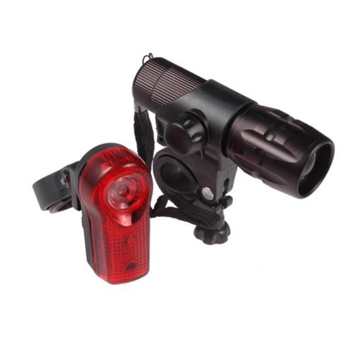 Lampa przednia soczewkowa z regulacja pola świecenia. 1 dioda kwadratowa 1W. Mocne światlo. Długość: 105mm. 3 funkcje . stałe mocne światło. stałe słabsze światło. migające. Wodoorporna. Zasilana bateriami AAA x3 (nie zawiera baterii) . Uchwyt w komplecie. Obudowa aluminiowa. Kolor: czarny. Lampa tylnia:. 3 diody. 3 funkcje .
