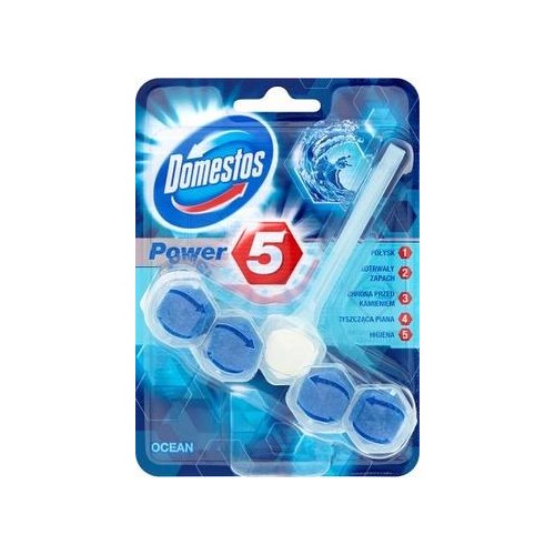 Domestos Power5 to bardzo skuteczna zawieszka do toalet w formie pięciu kulek. Kulki są kolorowe i ładnie prezentują się w muszli. Zamknięte są w szerokim koszyczku, dzięki czemu czyszcząca siła dociera w każdy zakamarek toalety. Koszyczek jest łatwy do zawieszenia na muszli, nie przesuwa się po krawędzi sedesu oraz nie spada. Przy każdym spłukaniu kulki uwalniają czyszczącą pianę, pozostawiając muszlę niezwykle higieniczną i chronioną przed atakami drobnoustrojów. Orzeźwiający zapach maskuje te nieprzyjemne wydzielające się z muszli toaletowej.